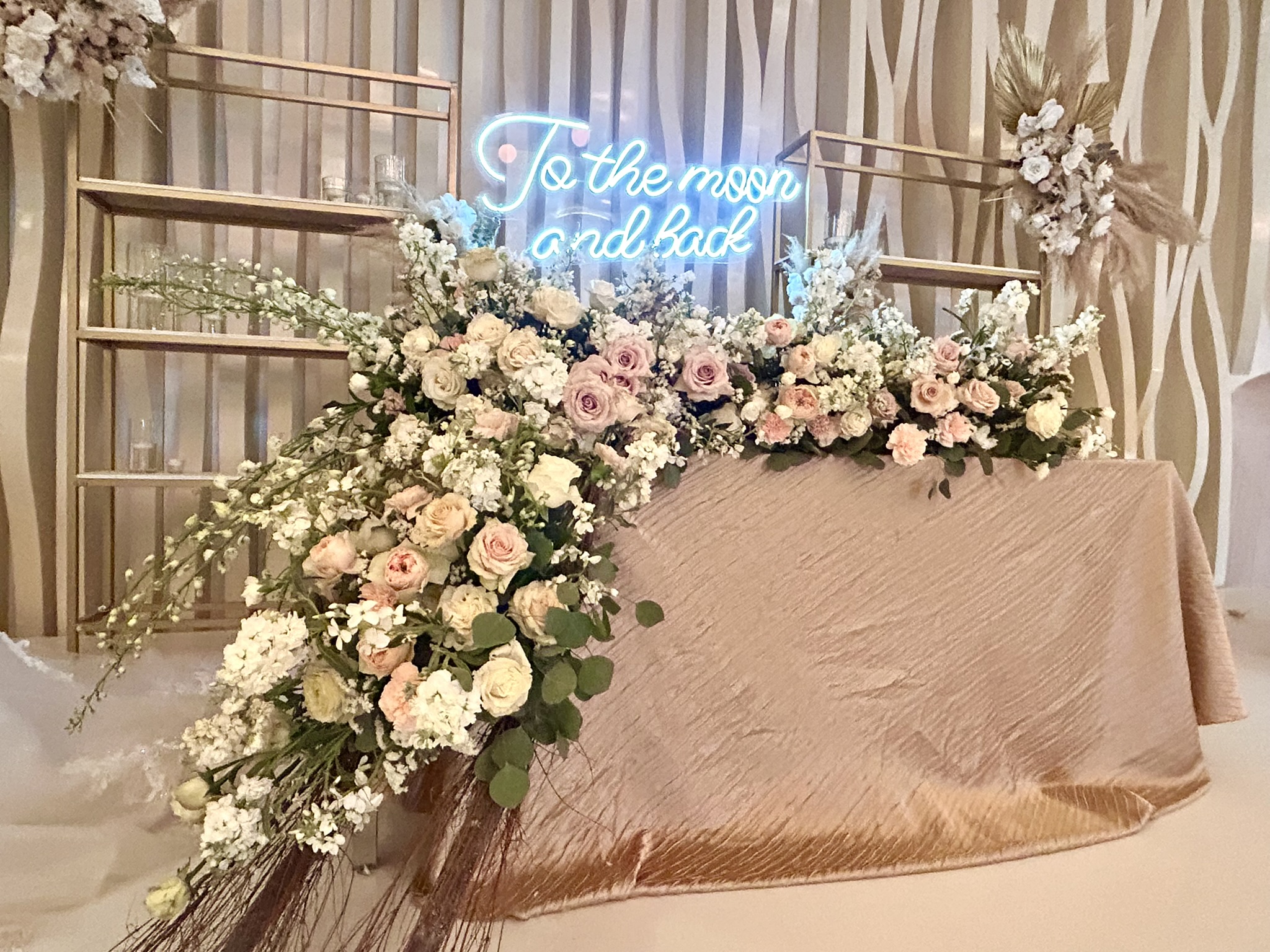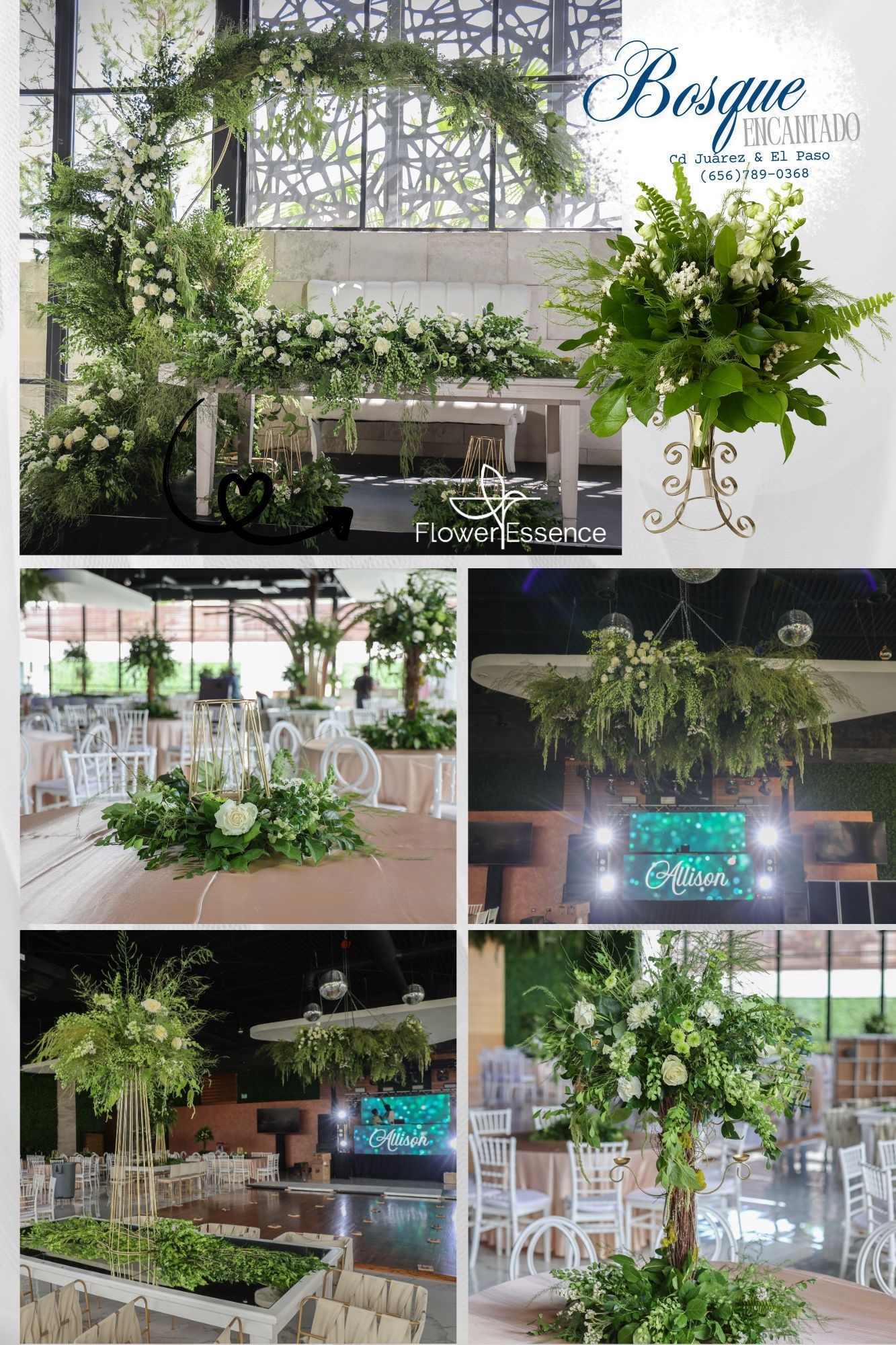 Combinaciones pastel + brillo, arreglos verticales y backdrops florales llamativos.