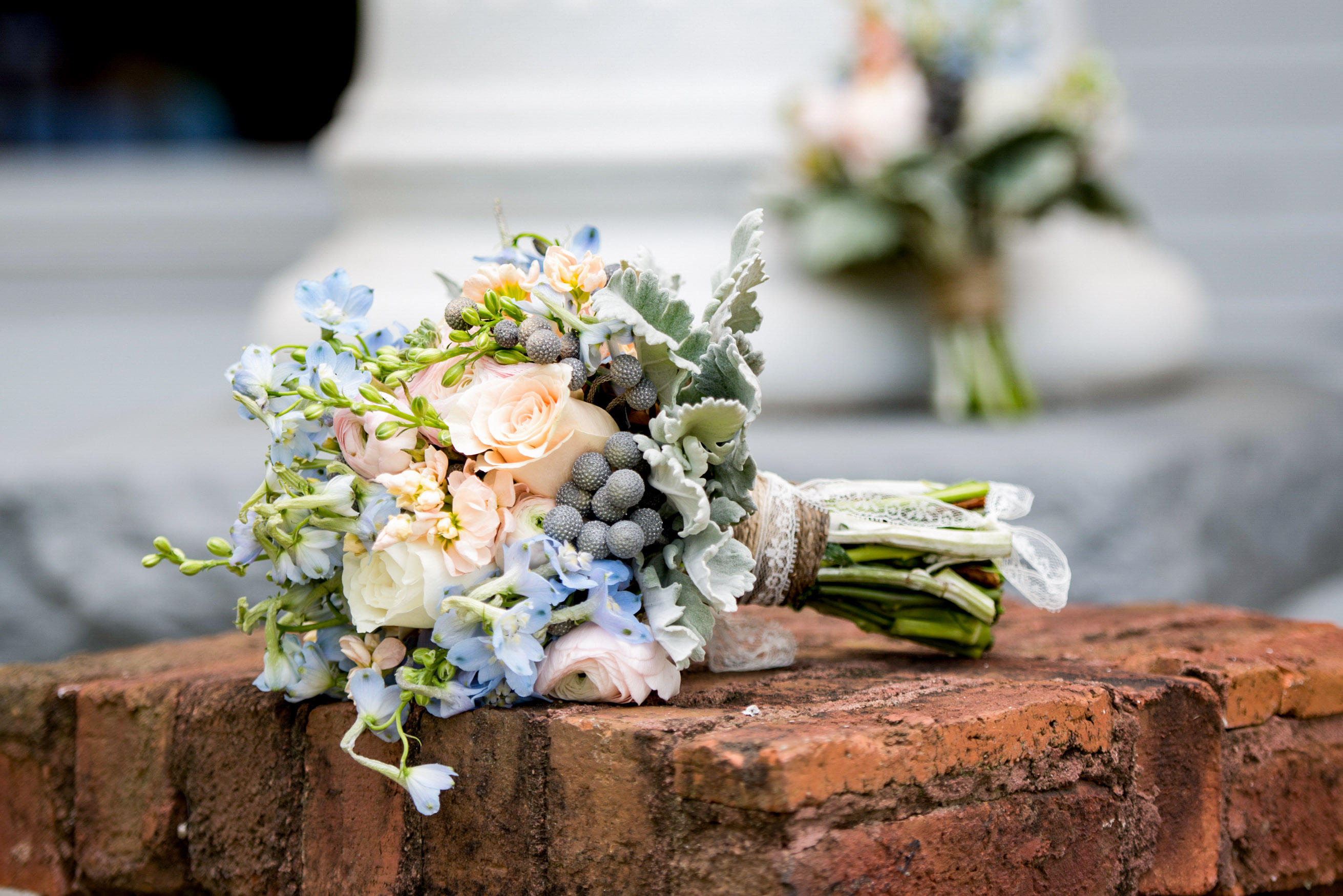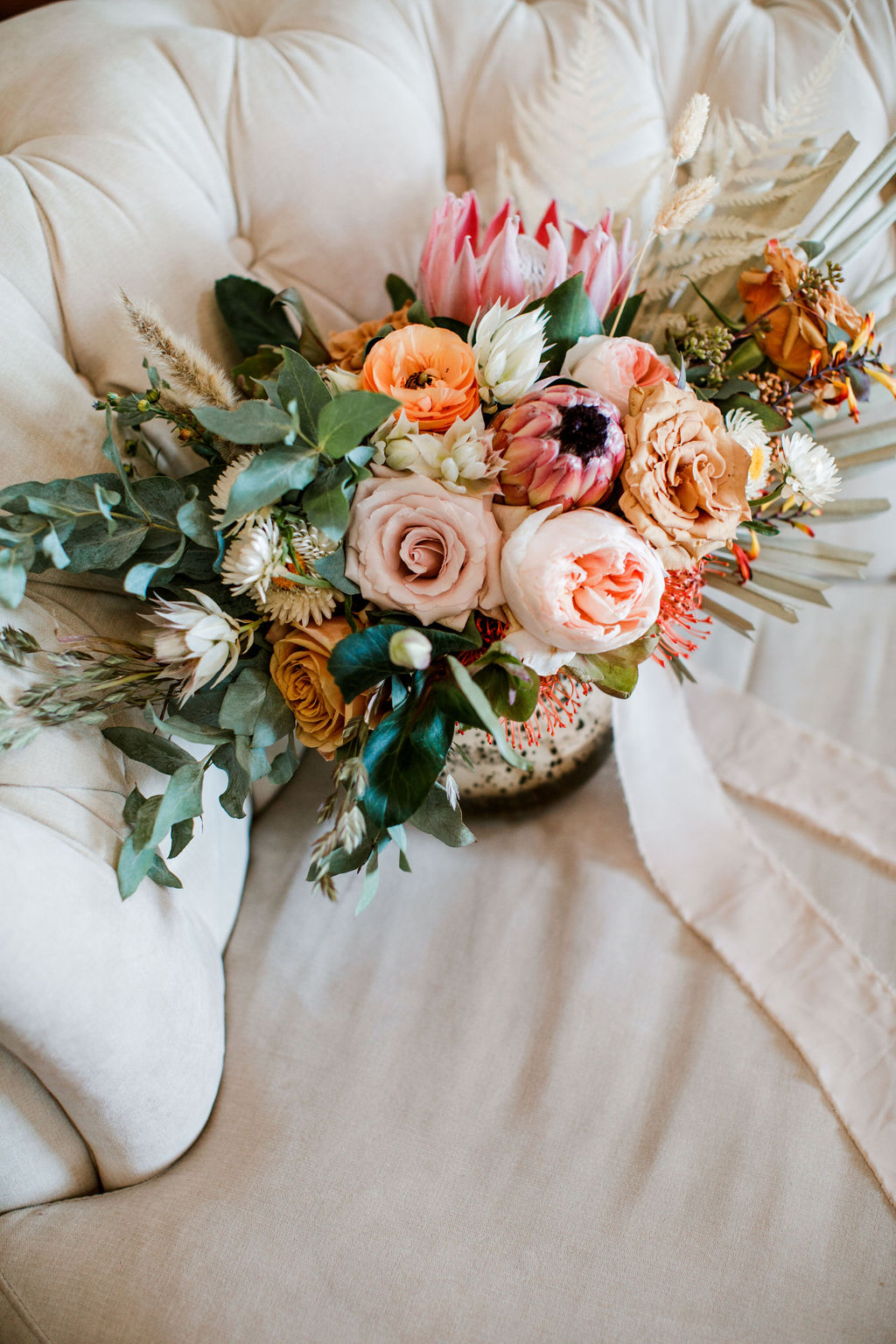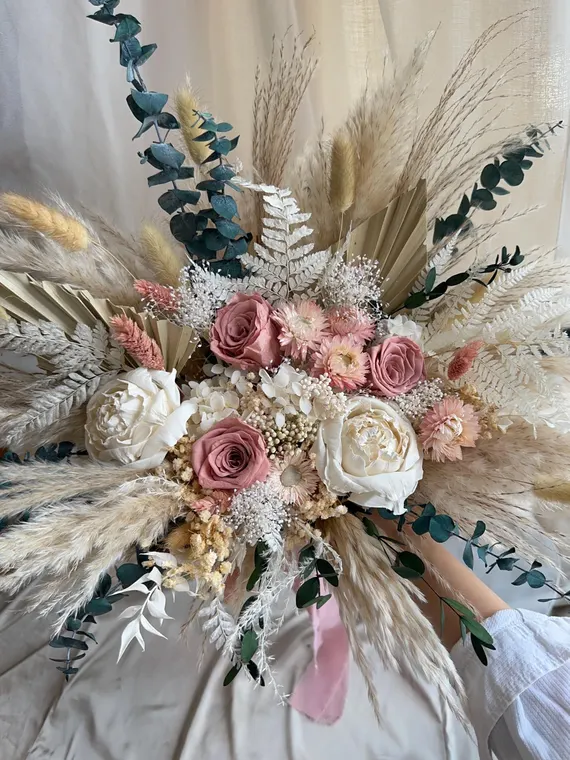 Flores frescas combinadas con hierbas secas, follaje arquitectónico y pampas para lograr profundidad y dimensión.
