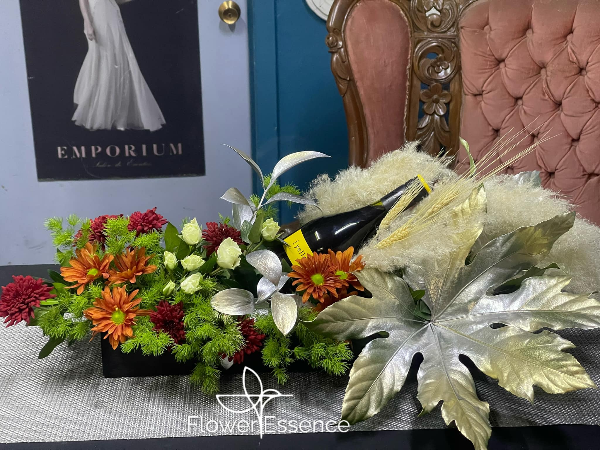 Paleta: tierra y neutros (terracota, beige, verde oscuro). Flores: hojas secas, ramas, flores de temporada. Estilo: cálido y elegante.